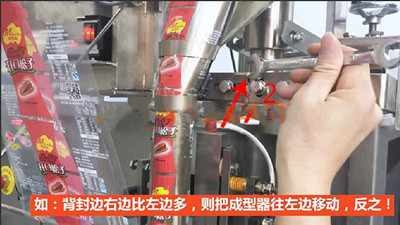 1)包裝膜安裝好后,開(kāi)機(jī)測(cè)試,包裝膜制袋后,出現(xiàn)如下圖包裝袋背面封口左邊袋子邊比右邊袋子邊短小的情況。接下來(lái)根據(jù)包裝膜拉膜跑偏的情況調(diào)節(jié)包裝機(jī)的成型器。